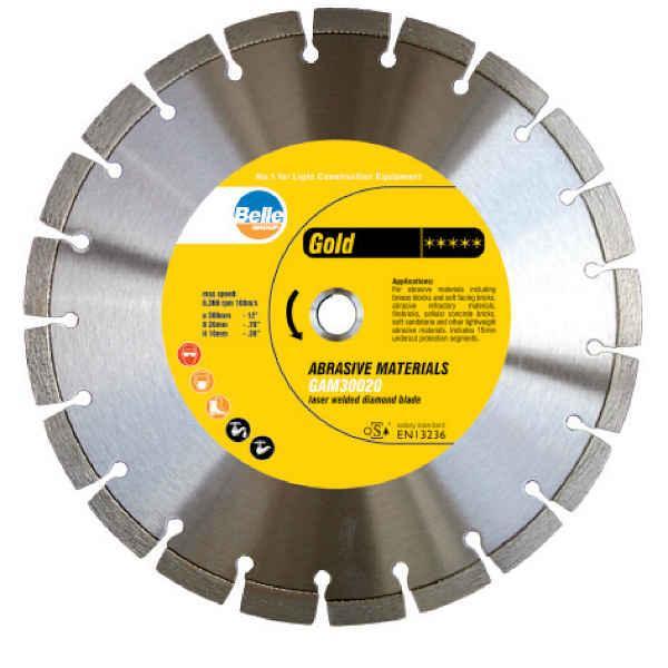 The Altrad-Belle Gold General Masonry Diamond Blade is a high-quality cutting tool designed for professionals working with a variety of masonry materials. It delivers efficient, precise cuts, making it ideal for medium aggregate concrete, general masonry products, stock paving bricks, most roofing tiles, and hard sandstone.