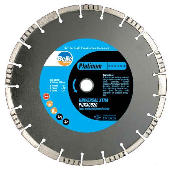 The Altrad-Belle Platinum Universal Xtra Diamond Blade is a high-performance cutting tool designed for versatility across various construction materials. Ideal for professionals requiring efficient cutting solutions, this blade excels in handling concrete (including green concrete), asphalt (including asphalt over concrete), and masonry materials such as paving slabs and bricks. Its robust construction provides precise and long-lasting cutting performance.