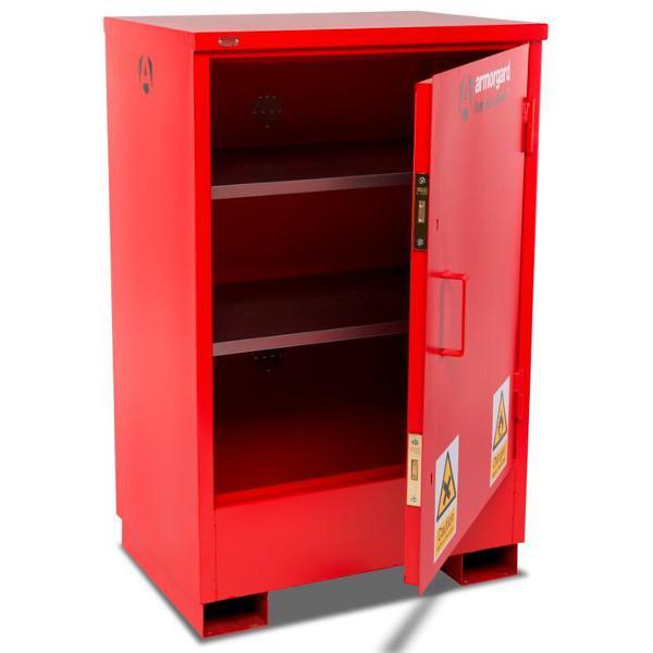 Constructed from heavy-duty steel with a traffic red powder-coated finish, the FSC2 offers excellent strength and visibility. It includes both high and low-level ventilation fitted with flame‑arrestor gauze to reduce fume buildup. The fully welded 115 L sump effectively contains spills. Two adjustable shelves, a five‑lever deadlock, warning signage, and forklift skids add to its practicality and safety.