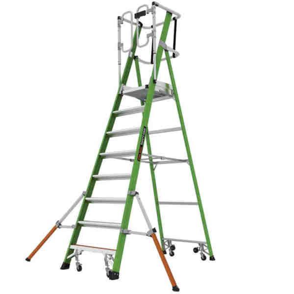 Constructed from non-conductive, high-visibility green fibreglass, this ladder ensures durability and safety, especially when working around electricity. Its robust design includes a fully enclosed platform with a toe kick and wraparound enclosure, providing a secure workspace. The ladder's lightweight nature facilitates easy transportation and setup.