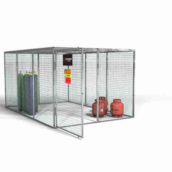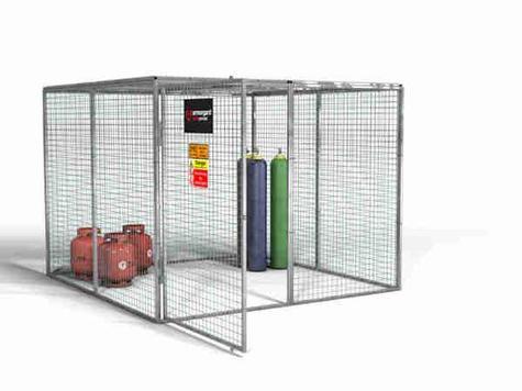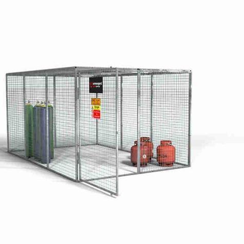 Built from 25 mm box-section steel and 3 mm wire mesh with a hot-dip galvanised finish, the GGC13 provides superior corrosion resistance and durability. It features a hinged padlock-ready door, pre-installed hazard signage, ventilated construction for COSHH compliance, and ground-fixable panels for enhanced stability.