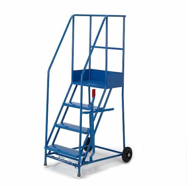A: The steps are equipped with 100mm nylon swivel castors and 200mm rubber tyres. While the information does not specify if the wheels are lockable, the design typically includes a mechanism to stabilize the steps when in use. For specific details, please consult the manufacturer.