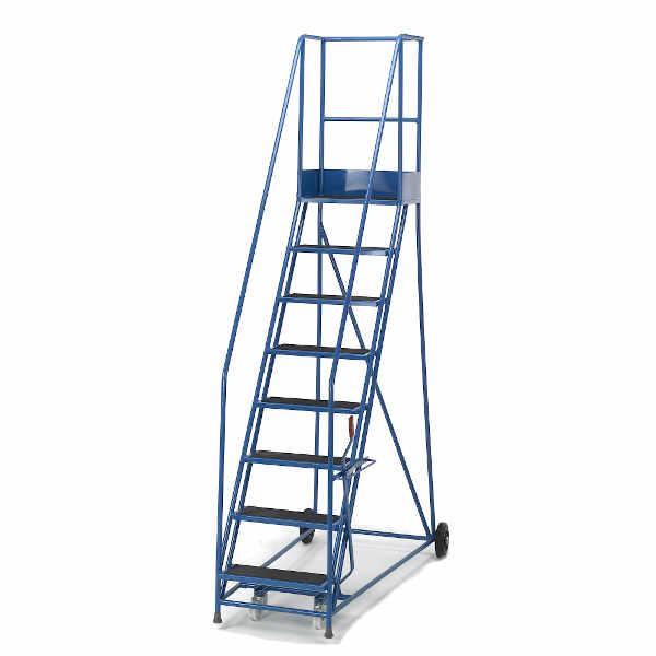 A: The steps are equipped with 100mm nylon swivel castors and 200mm rubber tyres. While the information does not specify if the wheels are lockable, the design typically includes a mechanism to stabilize the steps when in use. For specific details, please consult the manufacturer.