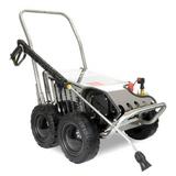 This pressure washer features a tough, robust stainless steel chassis and frame, providing exceptional durability and resistance to cleaning agents. The compact design, coupled with 8" puncture-proof wheels and a collapsible handle, ensures easy manoeuvrability and transportation across different job sites.